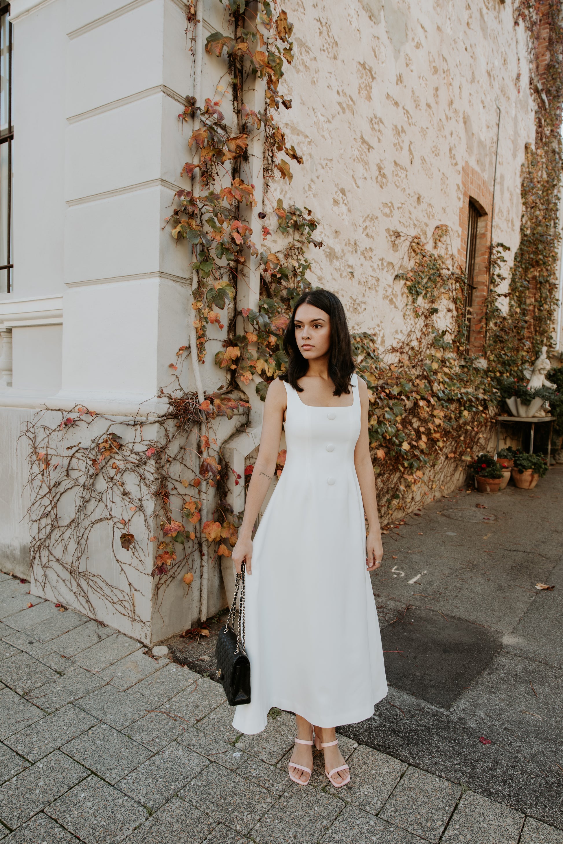 White flared midi skirt with a timeless square neckline and white button detailing to complete our timeless Sofia Dress.